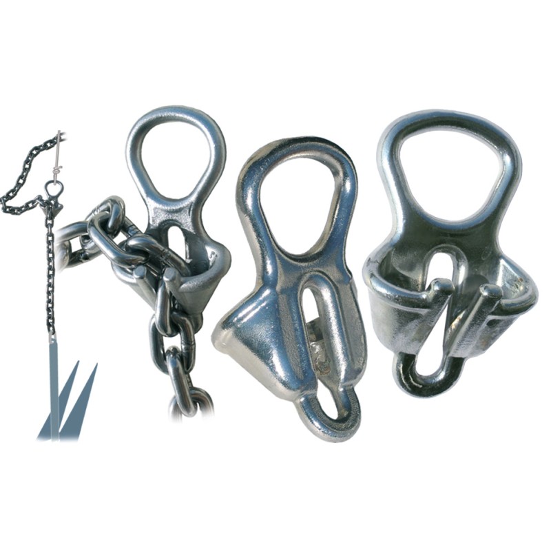 Dispositivo d'ormeggio e ritenuta catena ancora. Si artiglia alla maglia della catena e scarica il verricello dallo sforzo dell'ormeggio. Realizzato in ACCIAIO INOX AISI 316 lucidato.