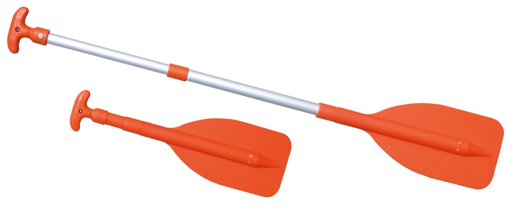 Mini pagaia telescopica in lega leggera, con pala e particolari in plastica di colore arancione ad alta visibilità.