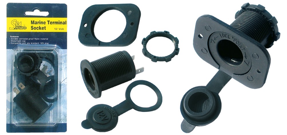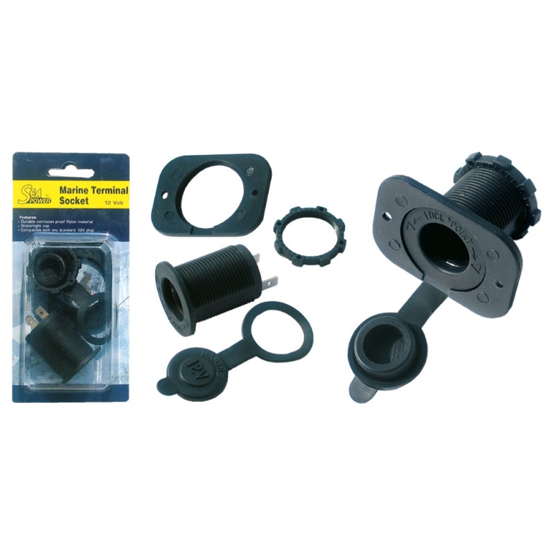 Presa di corrente ad incasso in policarbonato nero, tipo accendisigari dotato di cappuccio a tenuta stagna che impedisce l'ingresso dell'acqua.