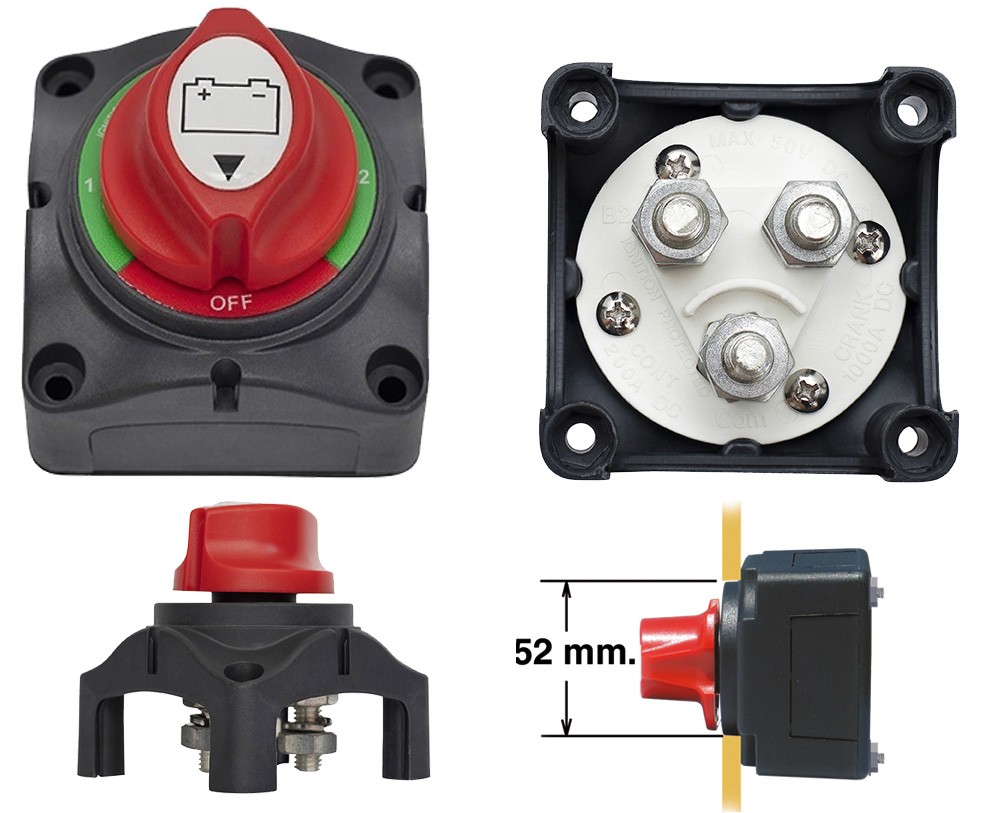 Selettore di batteria con manopola rotante a 4 posizioni con contatti in rame argentato. Molto compatto, applicabile sia in superficie che ad incasso praticando un foro da 52 mm. |