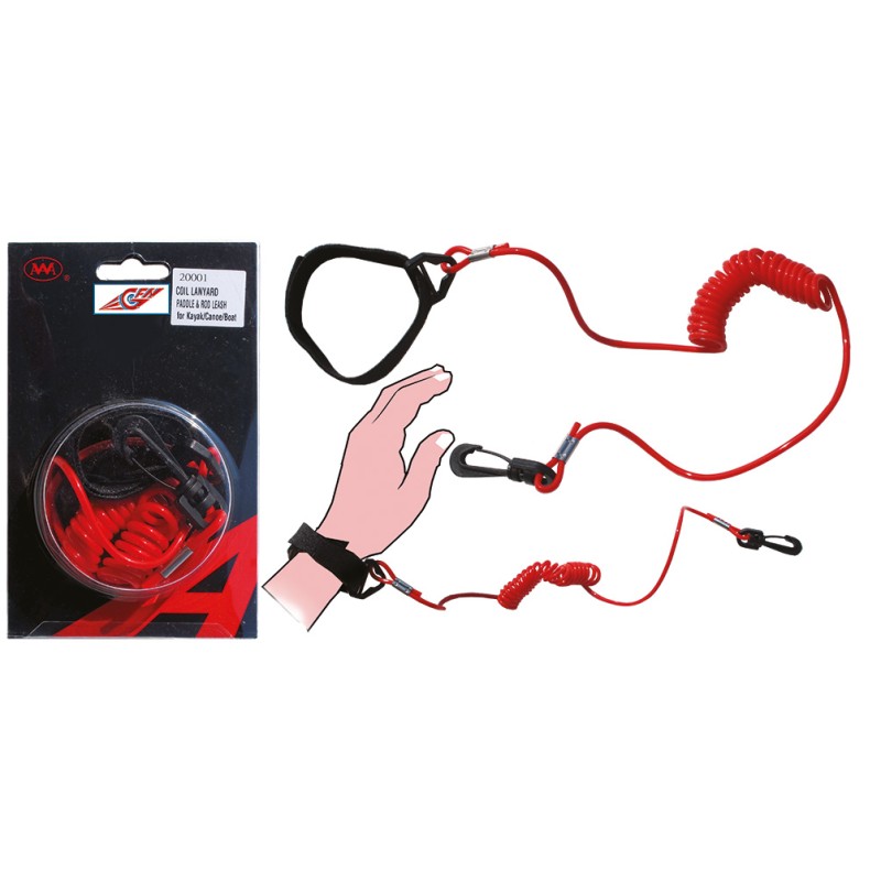 Cordino di sicurezza completo di clip girevole e cinturino in velcro per fissaggio al polso.
