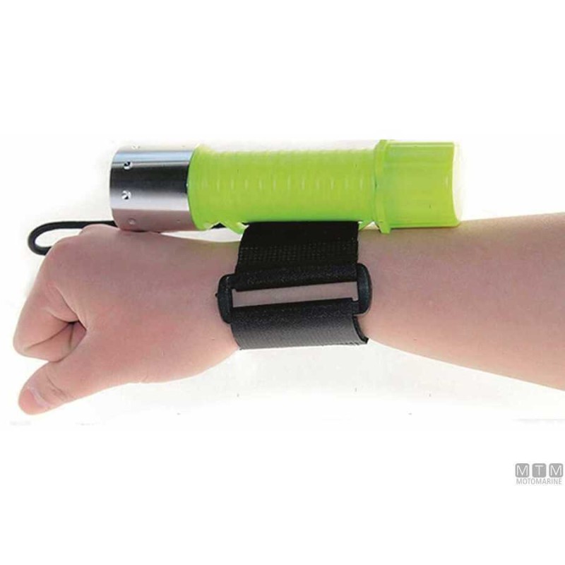 Potente torcia LED professionale totalmente stagna IP68 per uso subacqueo, pesca e diporto. Si può usare a mano, oppure, per avere le mani libere, fissata al braccio con la fascia a dotazione. Luminosità 800 Lumen. Portata 200 m.
