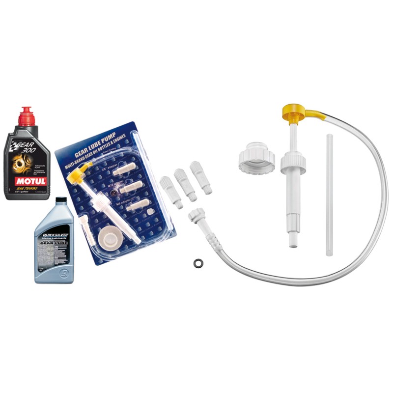 Pompa manuale con ghiera avvitabile direttamente al contenitore di olio piede motore, completa di adattatore sia per filetto USA che europeo e 3 raccordi (3/8”- M8 - M10) compatibili con qualsiasi fuoribordo 2 e 4 tempi, gruppi poppieri Volvo SX, Mercruiser, OMC e OMC Cobra.