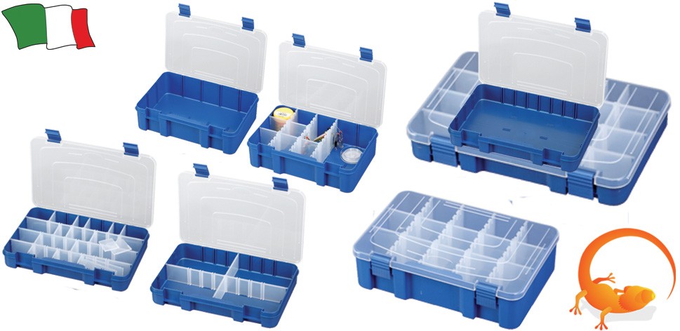 Contenitori multiuso serie "Kamaleont" con scomparti rimovibili, grazie a questa particolarità si possono realizzare da 1 a 15/20 scomparti a seconda del modello.