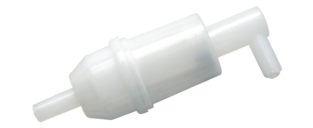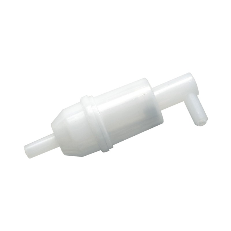 Filtro carburante trasparente di media dimensione ed angolazione a 90°, adatto per essere installato in linea su fuoribordo ed entrobordo di piccola cilindrata a benzina che diesel.