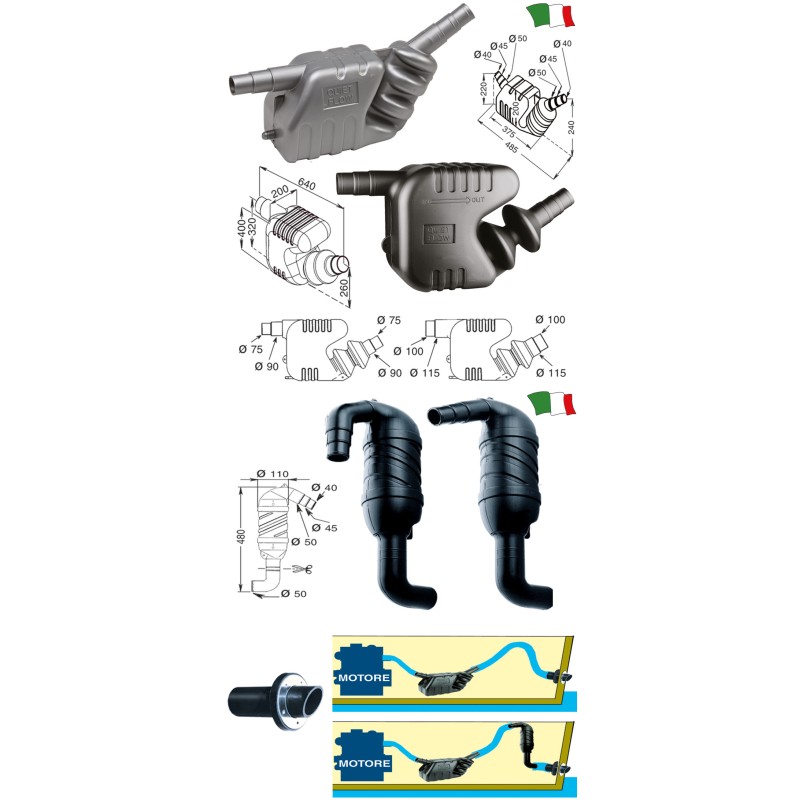 Marmitte con silenziatore per motori con raffreddamento ad acqua. Realizzate in polietilene ad alta densità per garantire una maggiore durata ed un ottimo abbattimento dei rumori di scarico. Provviste di raccordo per lo scarico dell’acqua nei mesi invernali.