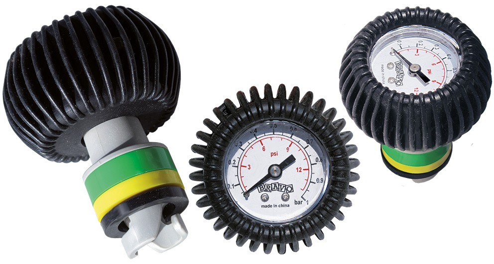 Manometro adattabile e di precisione per controllo della pressione di gonfiaggio fino a 1 bar per battelli pneumatici, per massimo comfort e sicurezza.