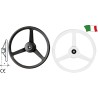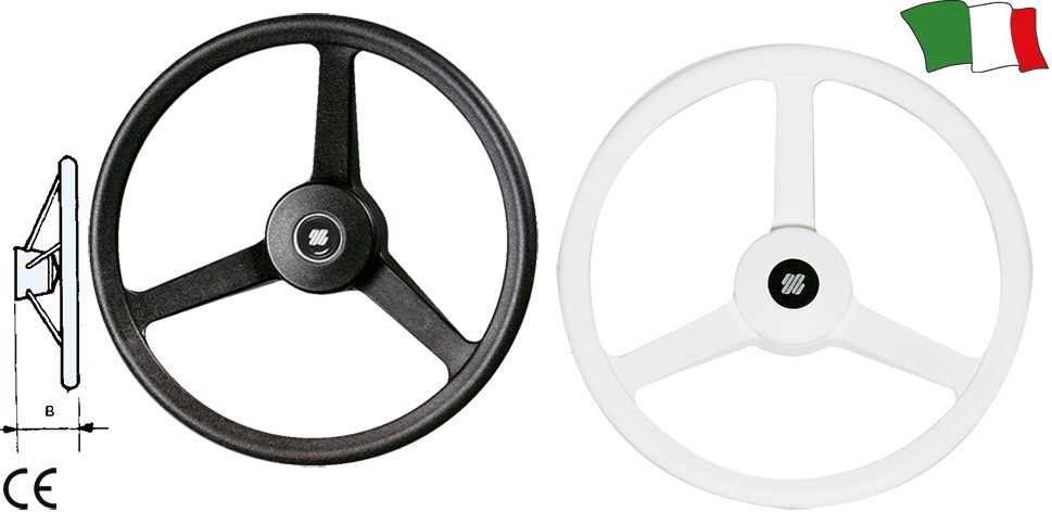 Volante a tre razze antiurto completo di mozzo in materiale termoplastico con impugnatura rigida. Adatto per piccole imbarcazioni e battelli pneumatici.